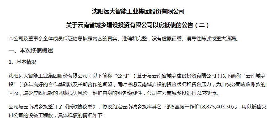 实际上,这并非是远大智能第一次接受“以房抵债”的方案。今年4月,远大智能也发布公告称,其与云南城乡投签订了抵债协议,由云南城乡投过户其名下的5处房产,抵偿远大智能三份项目合同项下的576.46万元债务。